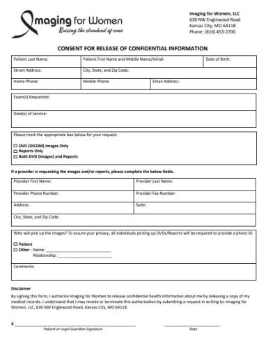 To request copies of your images and/or reports, please click this link to complete your release online. Or you may complete the printable application below and email it to us at transcription@imagingforwomen.com. You may also request your records by calling us at (816) 453-2700 and selecting option 3. Copies of your reports are also available on our patient portal.